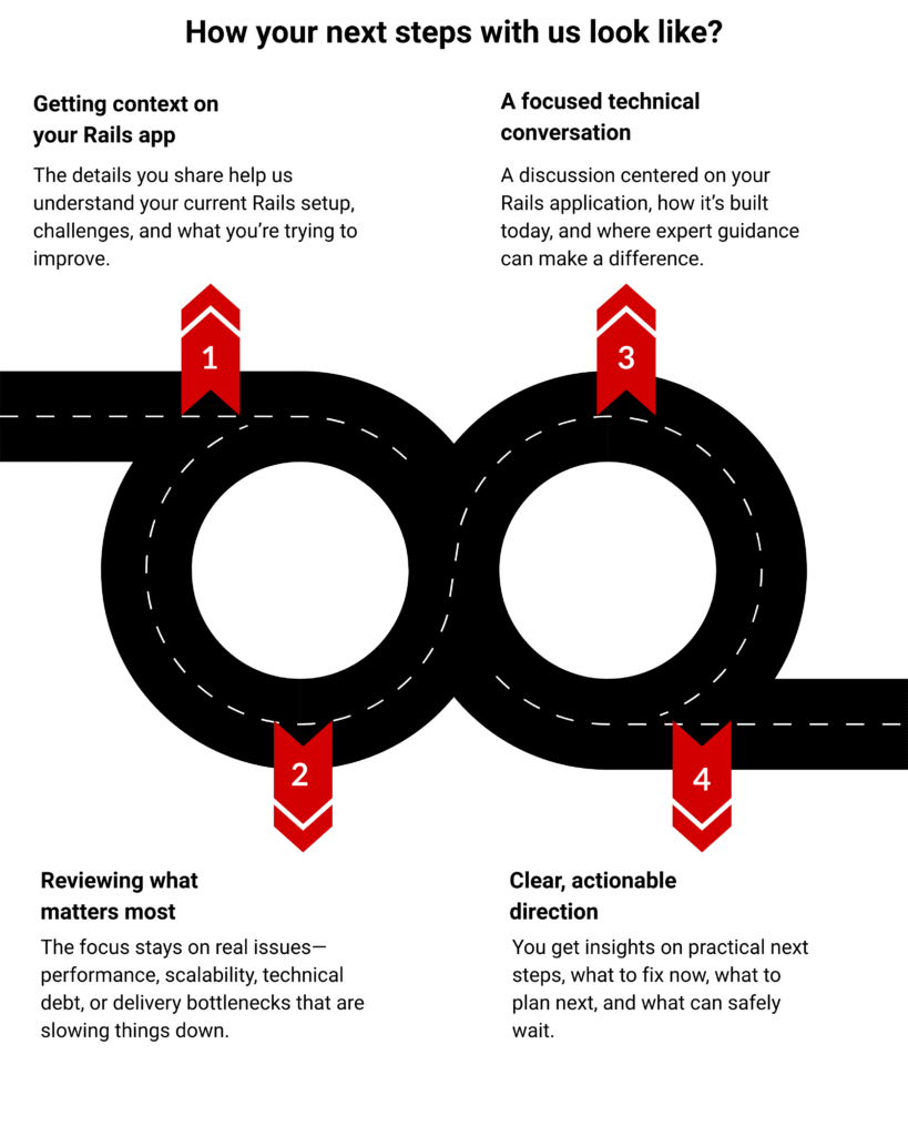 Your Rails app already works for the business. We address the true blockers to change, risk, performance issues, and fragile workflows, through audit, planning, and safe delivery.